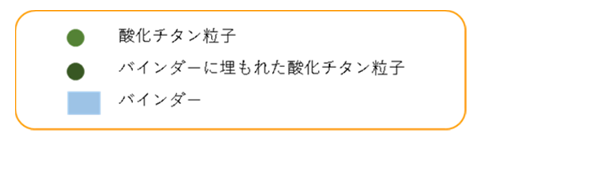サガンコートは、従来の光触媒コーティング剤のような有機溶剤やイオン分散などによる液化は行わず純粋な水系での決勝錯体分散溶液であり、施工後はバインダーを含まない純粋な酸化チタンだけの被膜が基材の表面に形成されるため、従来の酸化チタン製品と比べて高品質・高機能かつ自己劣化を起こさずに長期間光触媒効果を持続します。