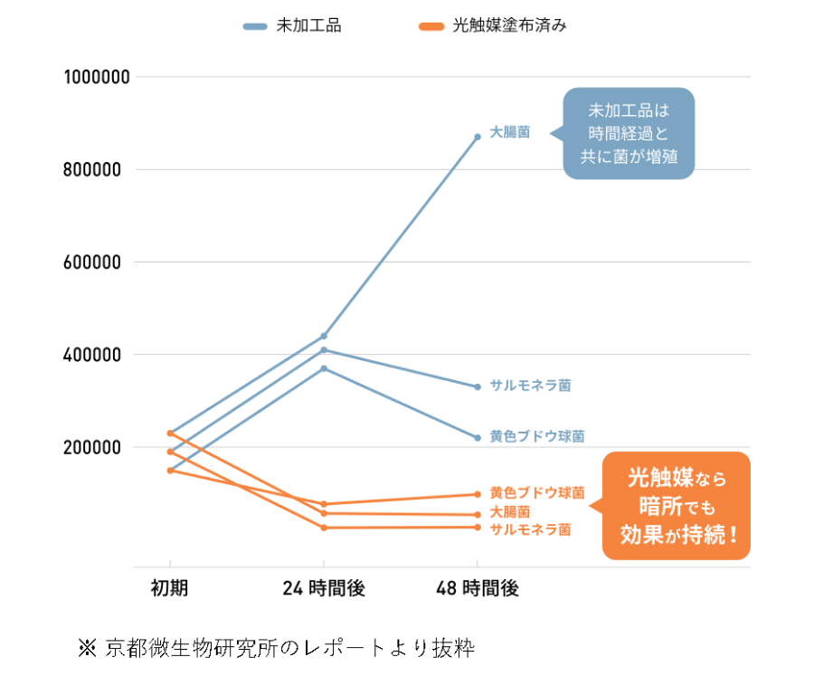 サガンコートは、光触媒のコーティング被膜が剥がれない限り、この抗菌・抗ウイルス効果を24時間365日休むことなく発揮し続けます。
