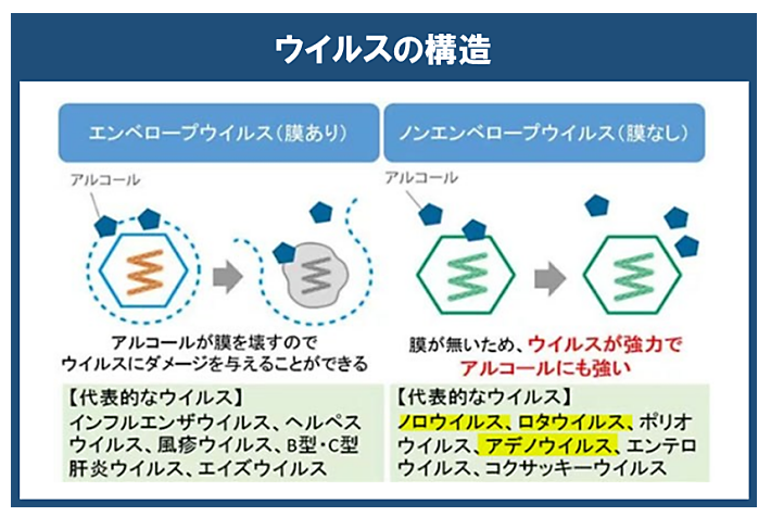 それは、アルコールが「エンベローブ」(ウィルスの外側にある脂質性の膜)を破壊することで、ウィルスの活動を抑えるからであり、ウイルス全体の約20%を占める エンベローブを持たないウィルス(ノンエンベローブウィルス)には、アルコール消毒の効果が ありません。