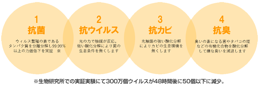 また、一般的な光触媒は太陽光(紫外線)によって効果を発揮するために一定の光が必要であり、暗所では効果が十分に発揮されませんが、サガンコートは、可視光線(蛍光灯の光)で十分効果を発揮し、また暗所でも効果を発揮することが大きな特徴です。