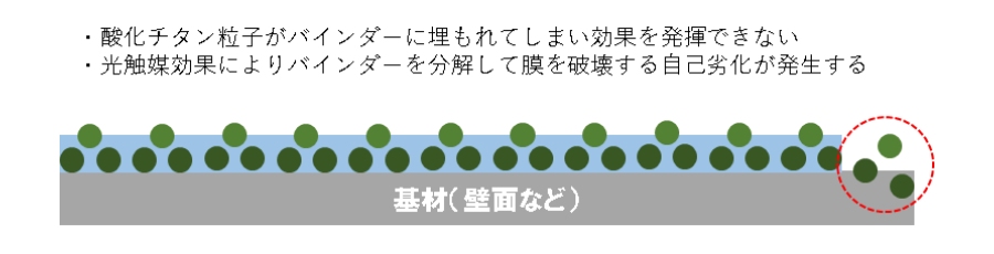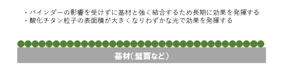 サガンコートは、従来の光触媒コーティング剤のような有機溶剤やイオン分散などによる液化は行わず純粋な水系での決勝錯体分散溶液であり、施工後はバインダーを含まない純粋な酸化チタンだけの被膜が基材の表面に形成されるため、従来の酸化チタン製品と比べて高品質・高機能かつ自己劣化を起こさずに長期間光触媒効果を持続します。