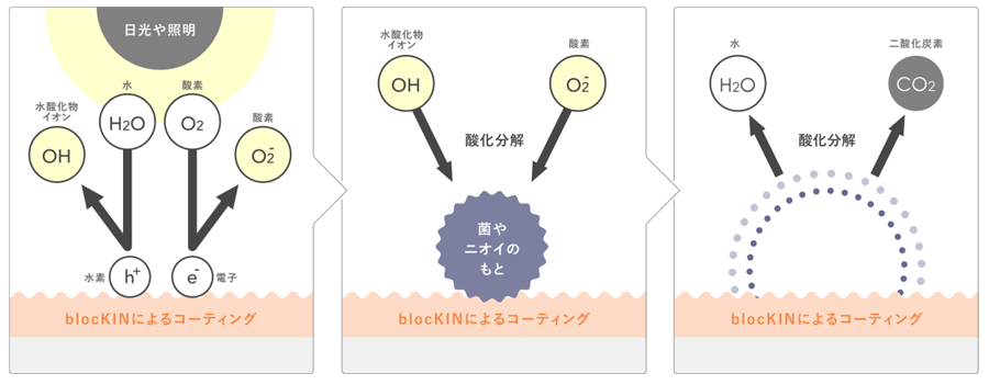 この作用を利用して、シックハウスの原因となる有害有機物や、汚れ、においの分解に役立てる技術を光触媒技術と呼んでいます。